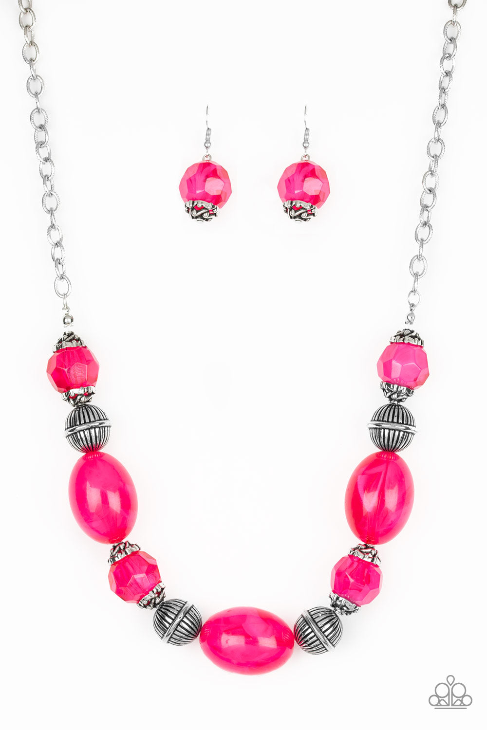 Featuring an array of antiqued silver beads, an icy collection of oversized glassy pink beads are threaded along an invisible wire below the collar for a colorful, statement making look. Features an adjustable clasp closure.